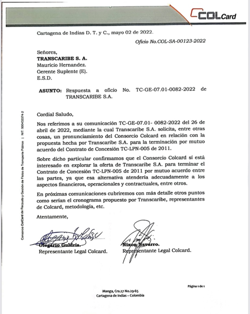 Ante los reiterativos amagues del alcalde de liquidar el contrato de recaudo, Colcard, en comunicación del 2 de mayo de 2022, le manifestó a la administración distrital que estaba dispuesta a una terminación por mutuo acuerdo. Sin embargo, nuevamente Transcaribe y el alcalde quedaron en nada.