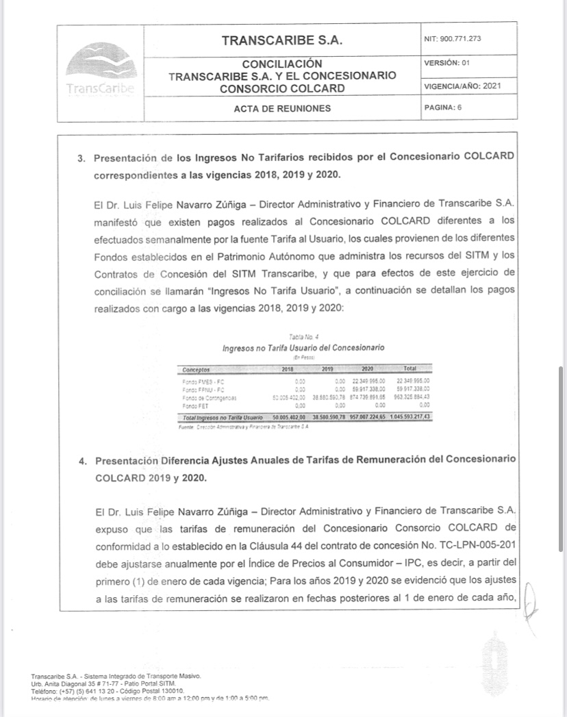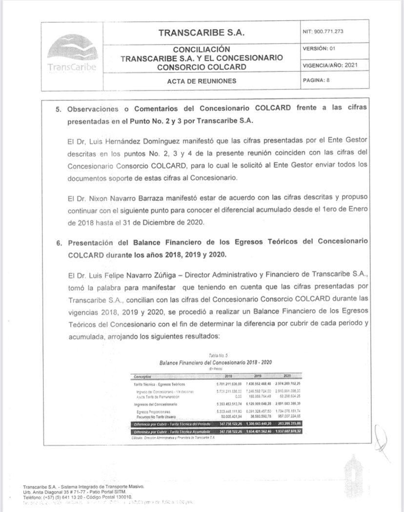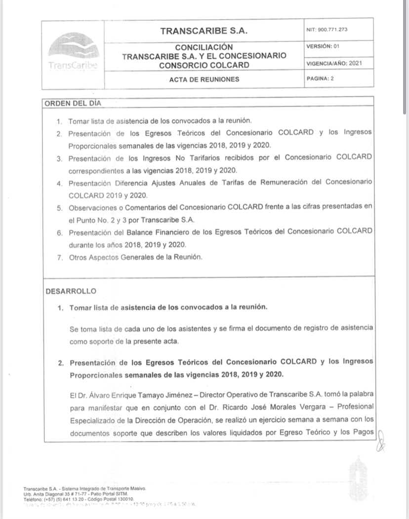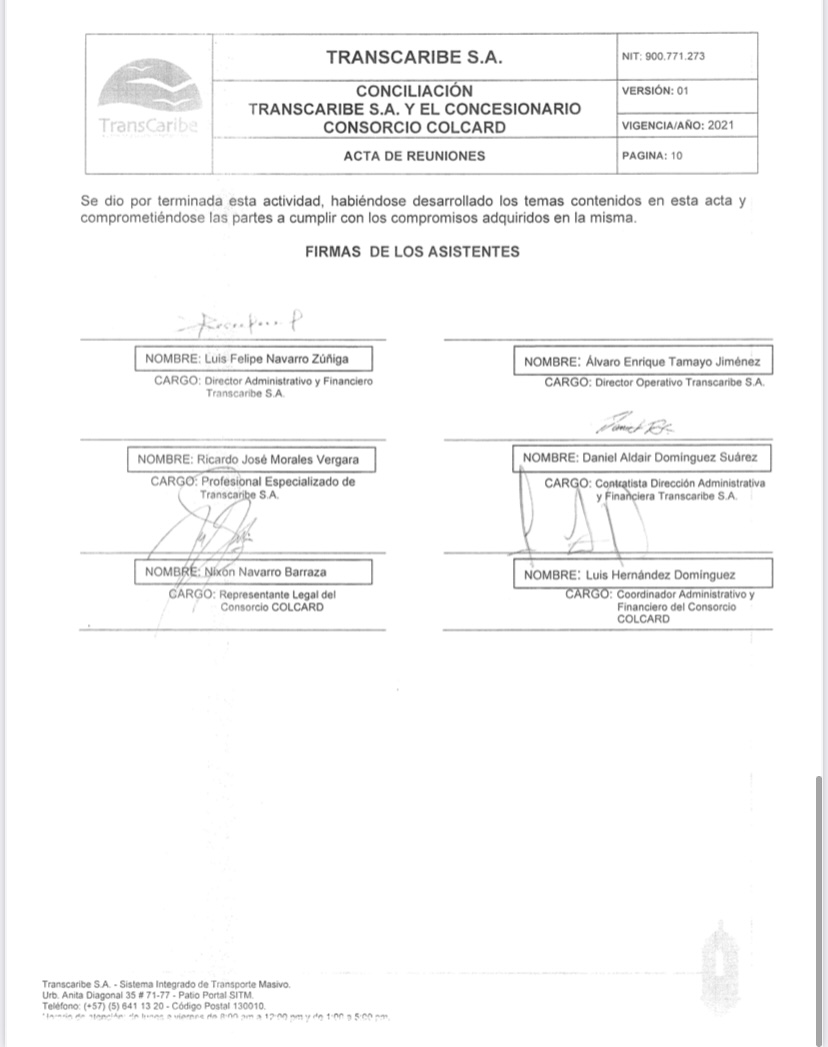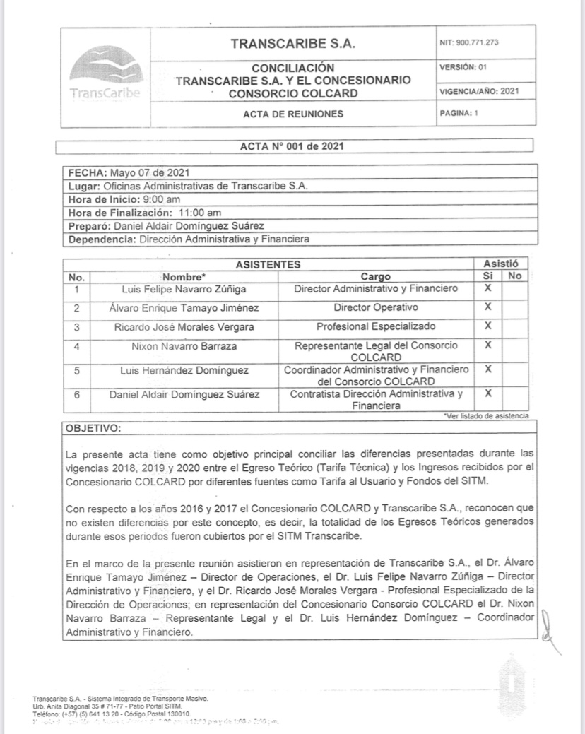 El 7 de Mayo se 2021, bajo acta número 01 del mismo año, Conciliación Transcaribe S.A. y el concesionario Consorcio Colcard, se firma por parte de los asistentes el documento que reconoce la deuda de Transcaribe y que no ha sido cancelada. Ello, dejaría sin peso la afirmación de Dau de supuestas extorsiones. ¿Desde cuándo cobrar de forma legal lo que se debe y está documentado es delito?.