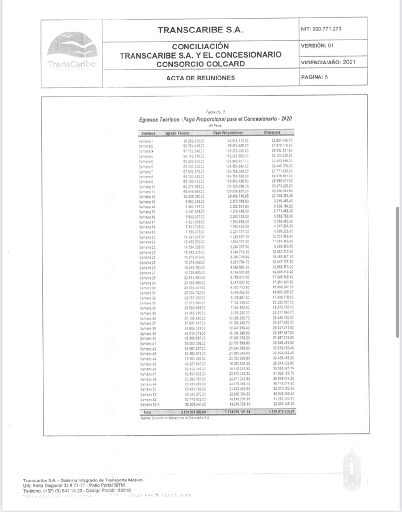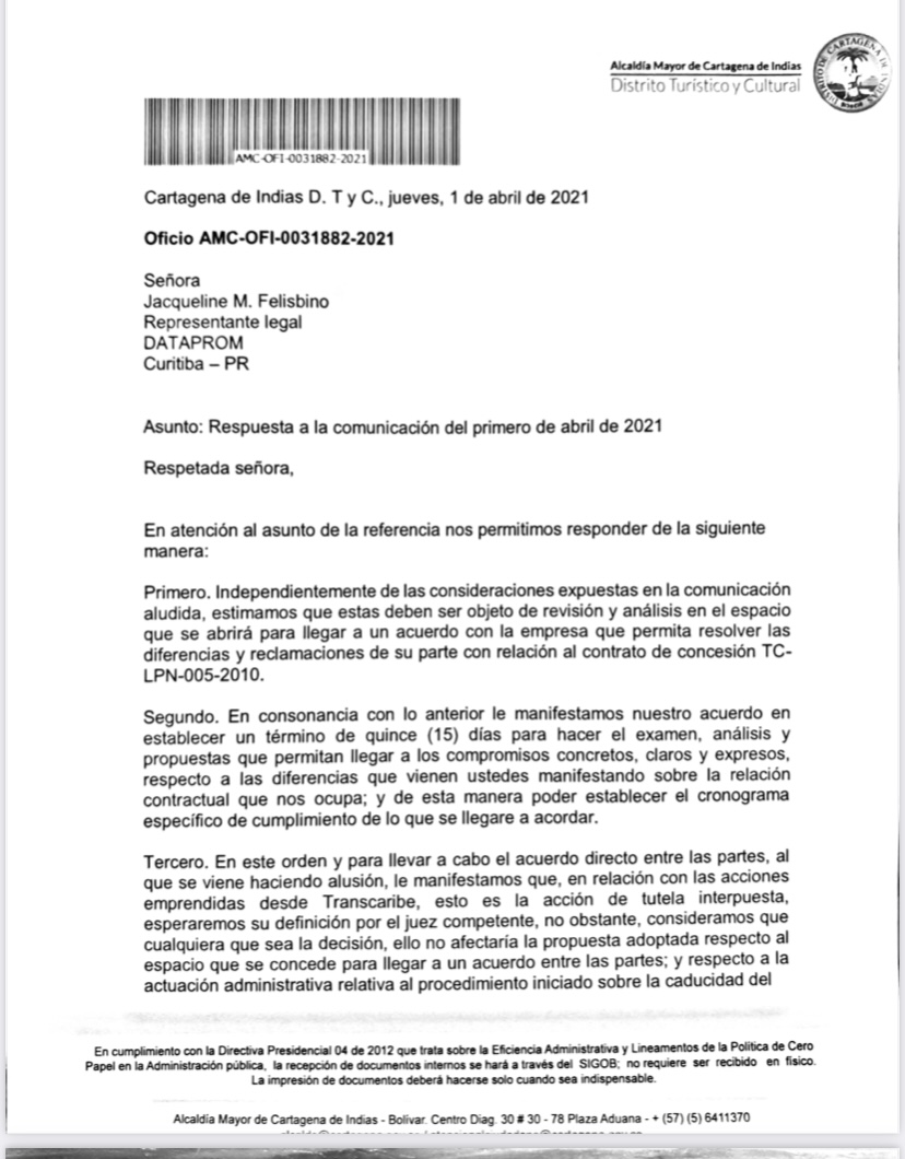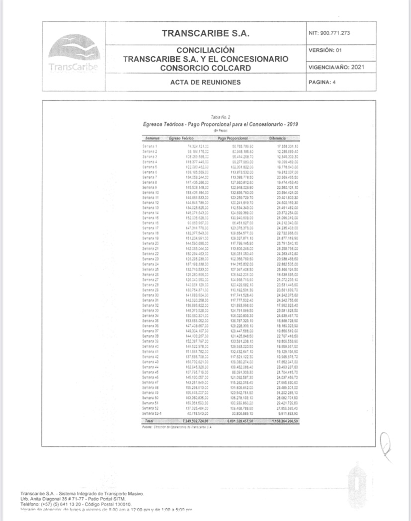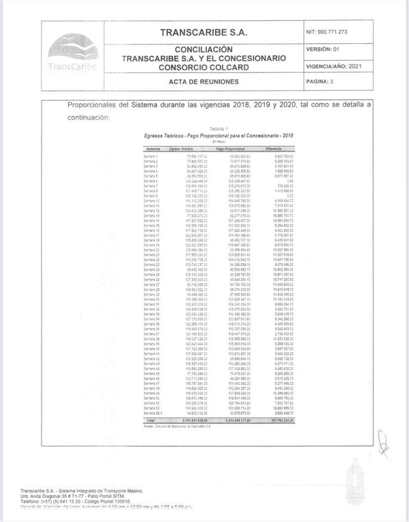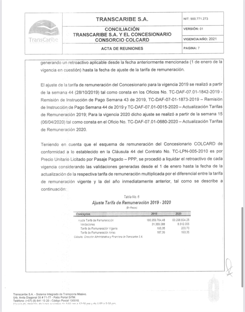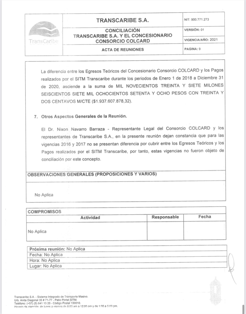 El 7 de Mayo se 2021, bajo acta número 01 del mismo año, Conciliación Transcaribe S.A. y el concesionario Consorcio Colcard, se firma por parte de los asistentes el documento que reconoce la deuda de Transcaribe y que no ha sido cancelada. Ello, dejaría sin peso la afirmación de Dau de supuestas extorsiones. ¿Desde cuándo cobrar de forma legal lo que se debe y está documentado es delito?.
