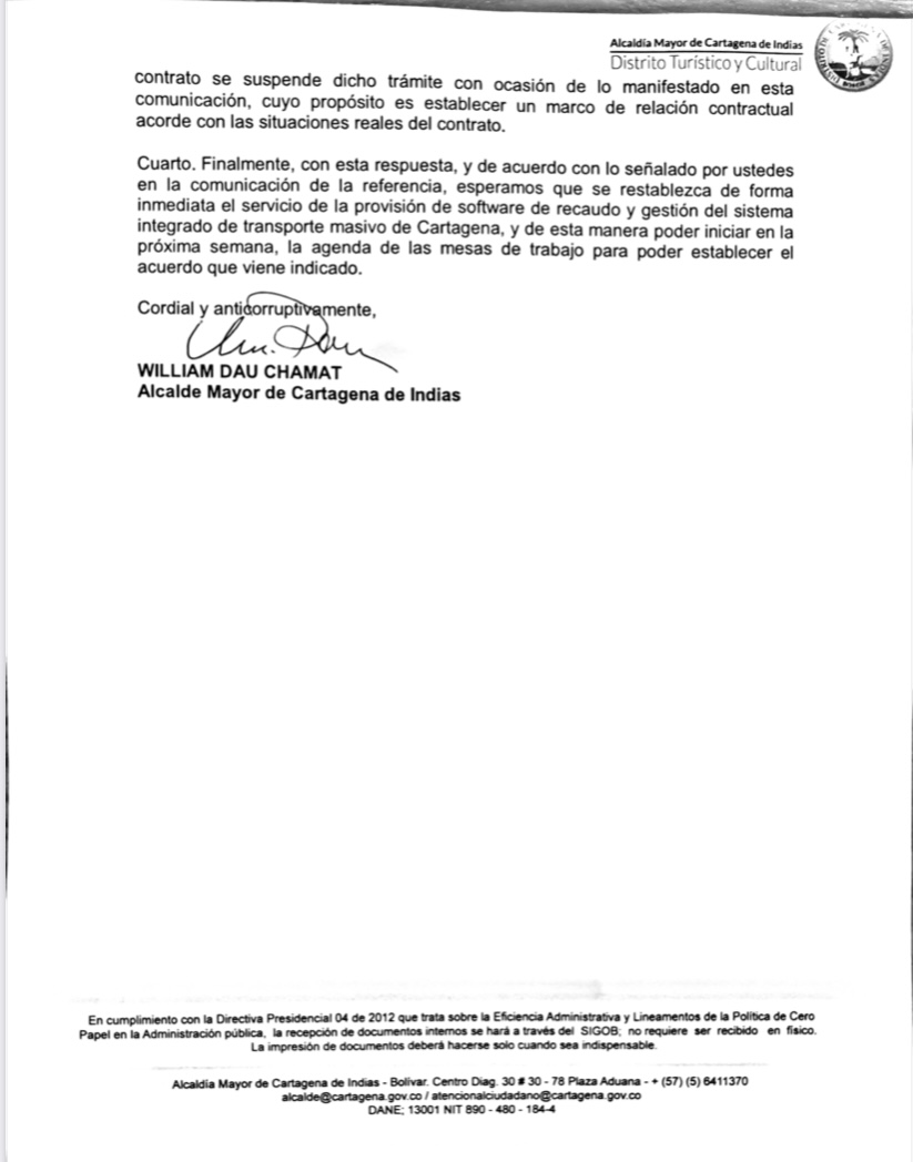 En mesas de trabajo desde el 2021, Dau Chamat se comprometió a sanear Transcaribe. El 1 ero de ese mismo año en carta dirigida a Jacqueline M. Felisbino, representante legal de DATAPROM, documento anexado a esta nota, pide el restablecimiento del sistema de recaudo y establecer mesas de trabajo para acordar pagos atrasados. Finamente, Dau incumplió.
