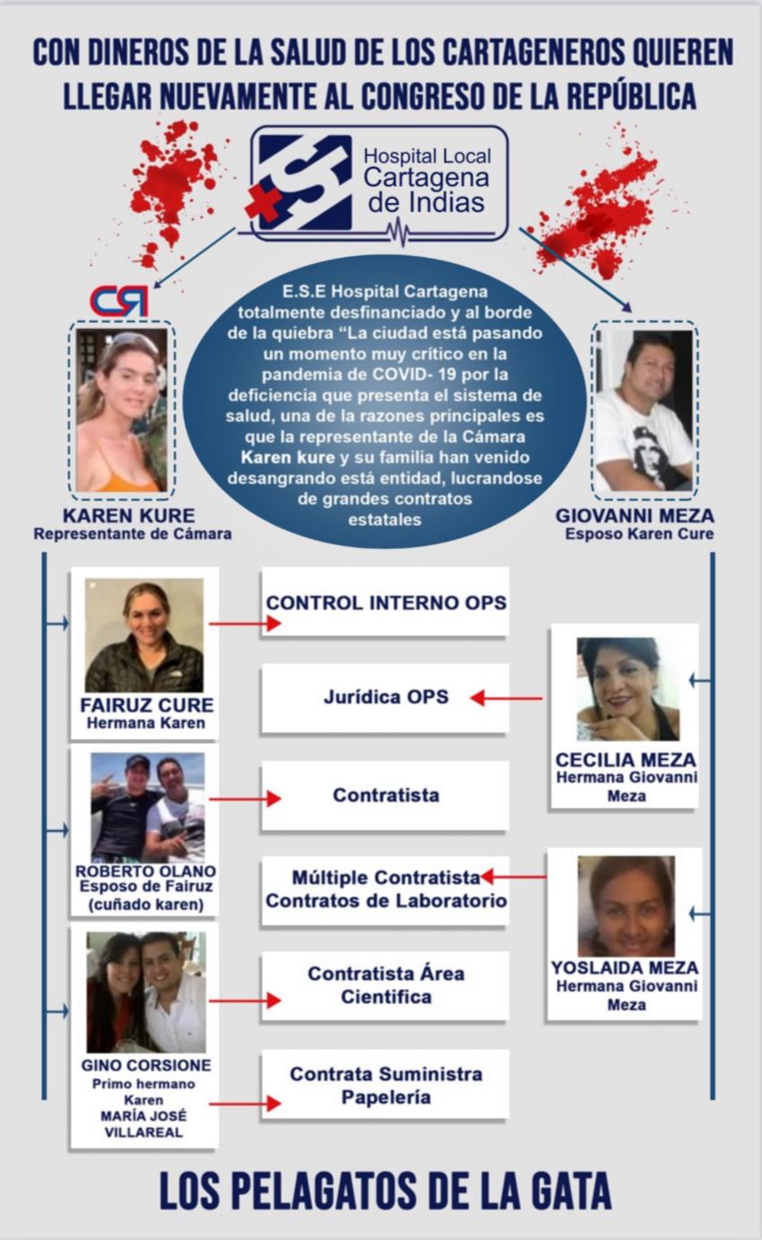 En el volante se afirma que, dentro de la ESE Cartagena, familiares de la congresista y su esposo tenían presuntamente control total de la entidad para poder tomar decisiones. Resida Fairuz Cure, hermana de la representante a la cámara, quien era de control interno de OPS; y Cecilia Meza, hermana de Giovanni, quien estaba en un alto cargo del departamento de jurídica.
