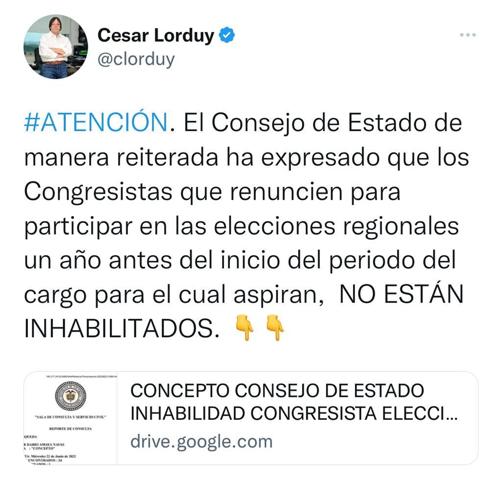 En su cuenta de Twiitter, Lorduy dijo: “ El Consejo de Estado de manera reiterada ha expresado que los Congresistas que renuncien para participar en las elecciones regionales un año antes del inicio del periodo del cargo para el cual aspiran, NO ESTÁN INHABILITADOS”, puntualizó.