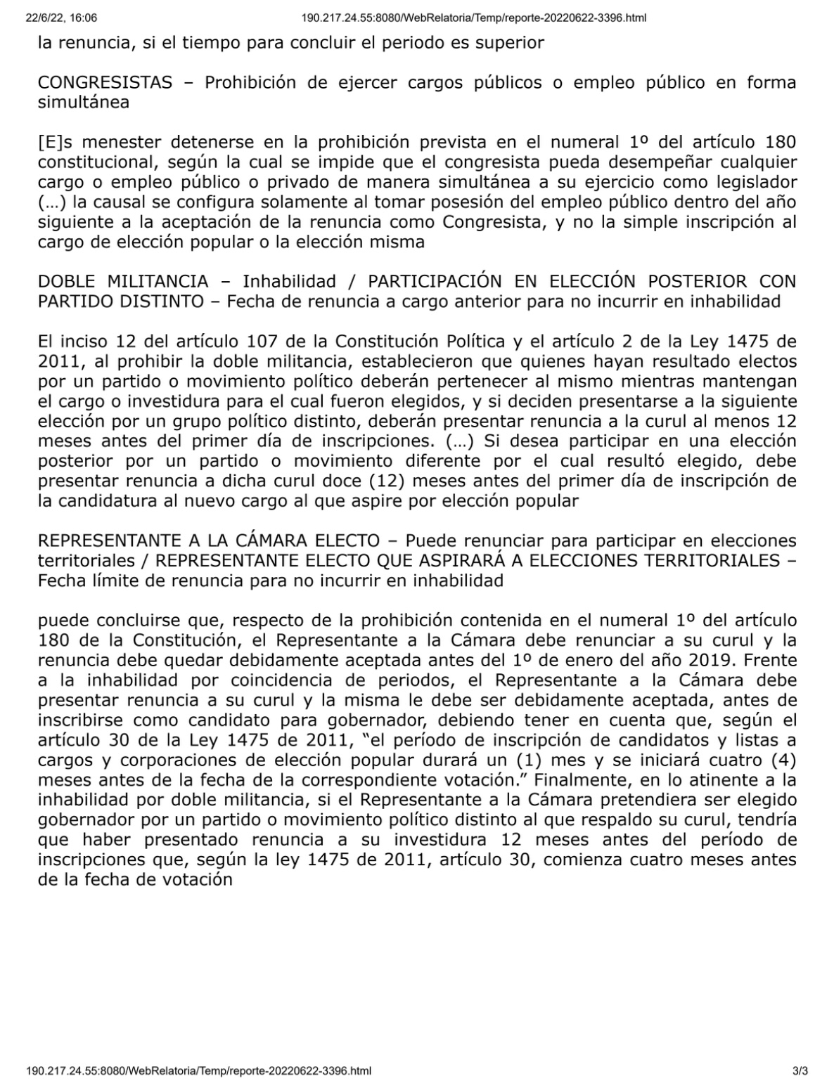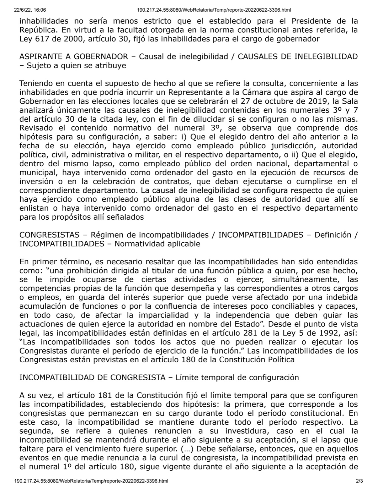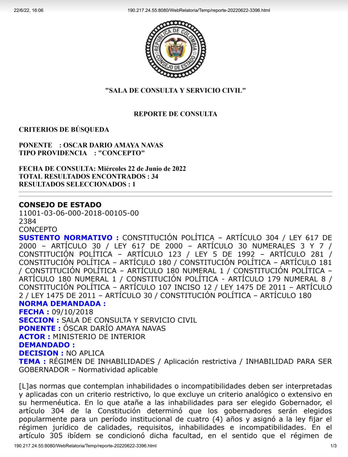“Quienes renuncien a su investidura, la prohibición prevista en el numeral 10 del artículo 180 constitucional, según la cual se impide que el congresista pueda desempeñar cualquier cargo o empleo público o privado de manera simultánea a su ejercicio como legislador (….) la causal se configura solamente al tomar posesión del empleo público dentro del año siguiente a la aceptación de la renuncia como Congresista, y no la simple inscripción al cargo de elección popular o la elección misma”, dice el Consejo de Estado en concepto 11001-03-06-000-2018-00105-00