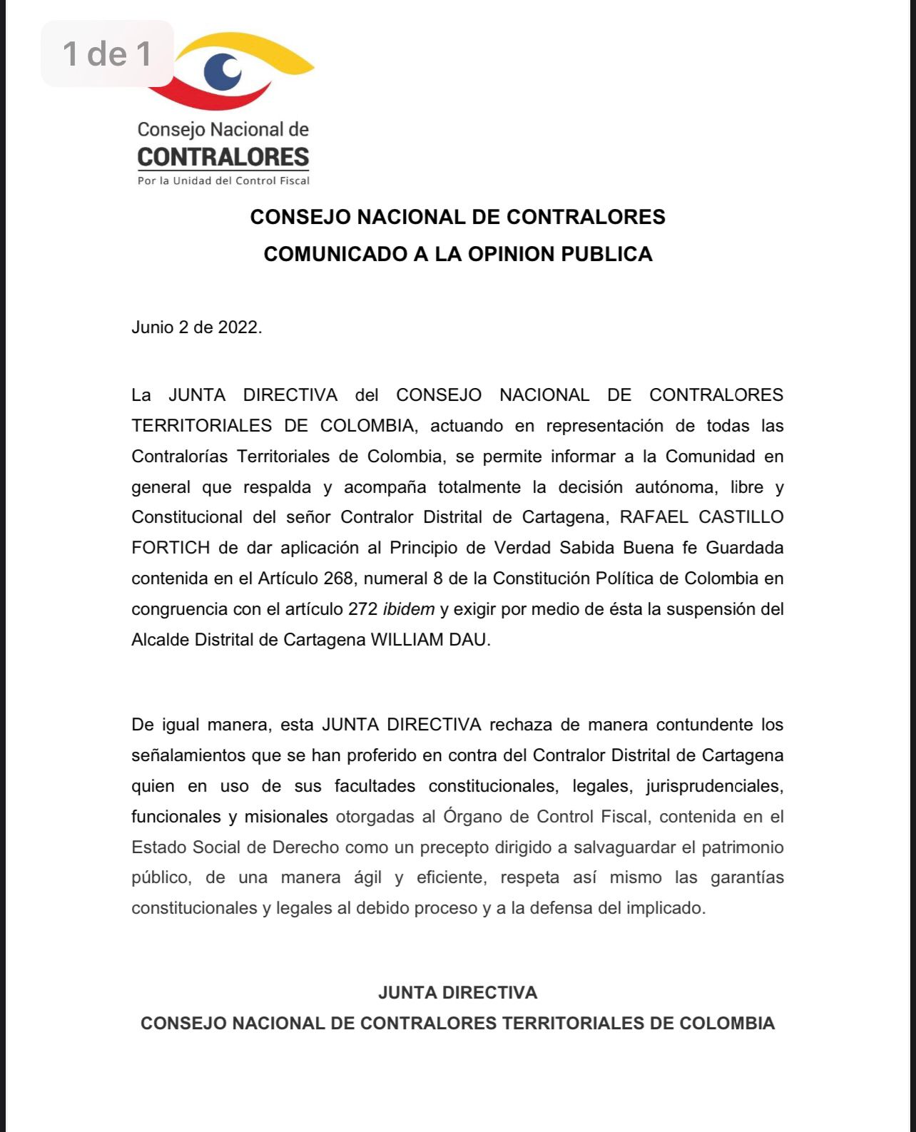 “Respaldamos y acompañamos totalmente la decisión autónoma, libre y Constitucional del señor Contralor Distrital de Cartagena, Rafael Castillo Fortich de dar aplicación al Principio de Verdad Sabida Buena fe Guardada contenida en el Artículo 268, numeral 8 de la Constitución Política de Colombia en congruencia con el artículo 272 ibidem y exigir por medio de ésta la suspensión del Alcalde Distrital de Cartagena William Dau”, expresan.