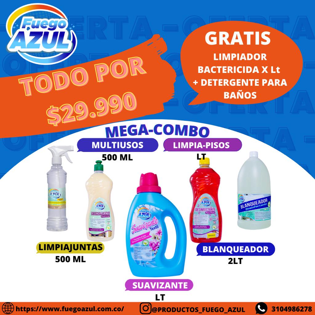 Debido a su contundente éxito, @productos_fuego_azul decidió tirar la casa por la ventana y sacar un kit de hogar que incluye suavizante, limpiajuntas, multiuso desengrasante, boanqueador, limpiapisos, limpiador, bactericida y detergente para baños por solo $29.990