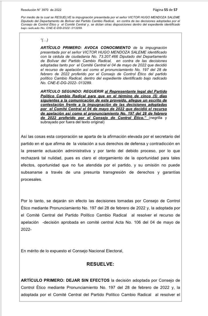 De acuerdo a la resolución 3970 de 2022, dicha decisión deja sin efecto las resoluciones expedidas por el partido CR que restringían tales derechos al visible diputado.