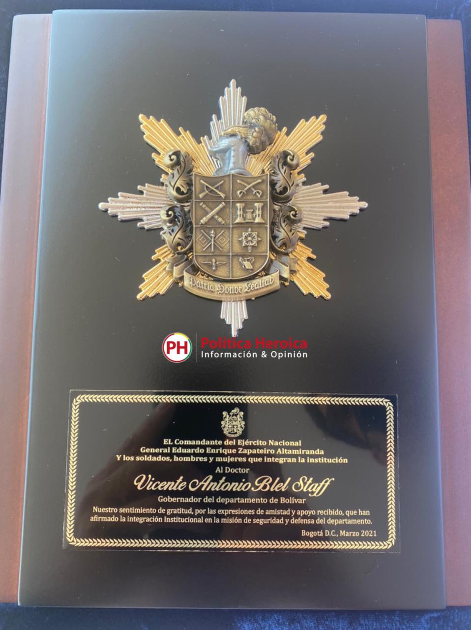 El gobernador de Bolívar, Vicente Blel Scaff, fue condecorado hace unos momentos por el Ejército Nacional, gracias al invaluable apoyo que ha brindado en la integración de la institucional, en la misión de seguridad y defensa del departamento.