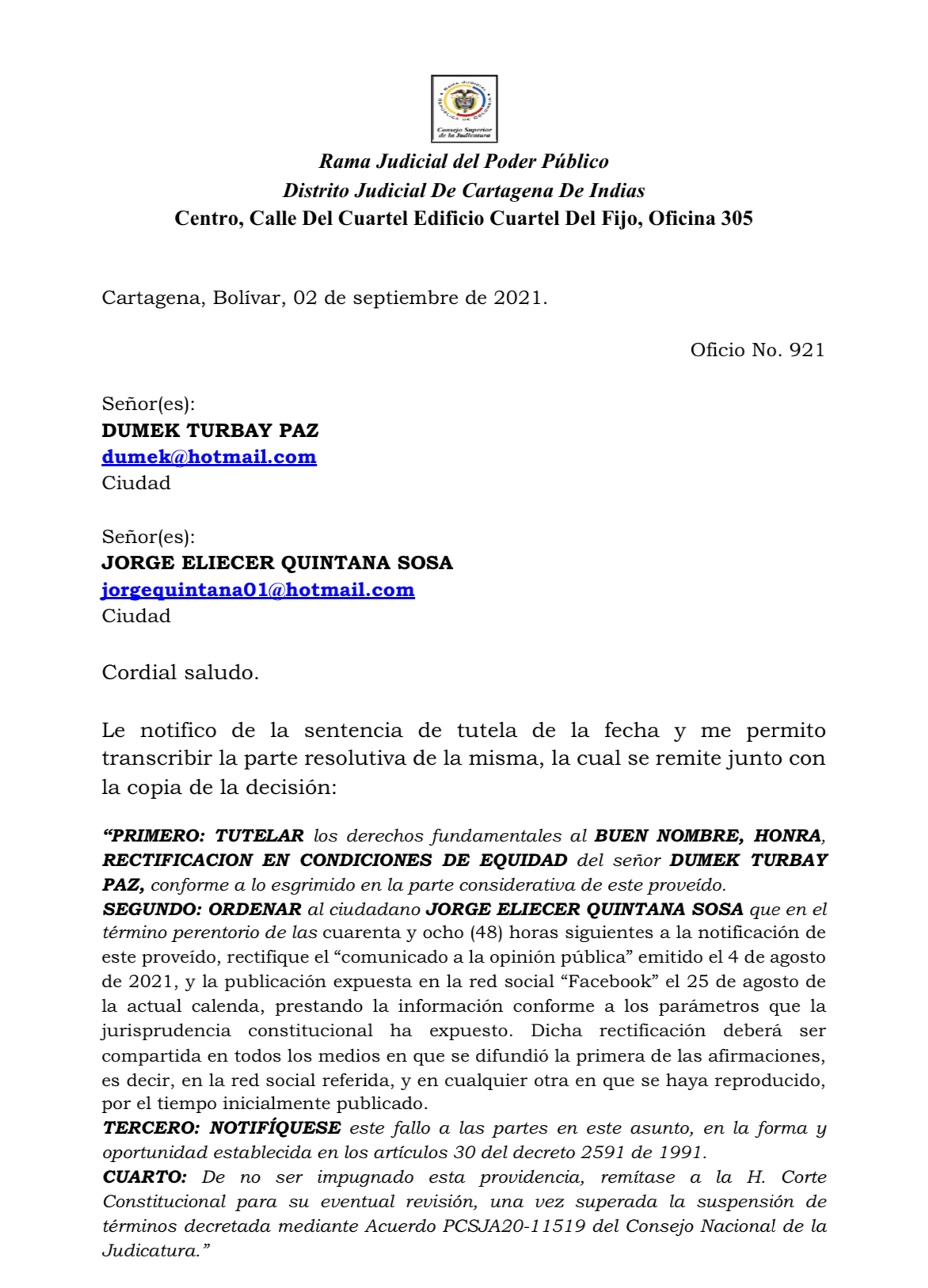 Quintana Sosa había denunciado al exgobernador Turbay Paz por la conciliación judicial entre el departamento de Bolívar y la Clínica Madre Laura S.A.S., durante el 2019. Sin embargo, esa judicatura consideró que “lo publicado por el demandado no puede enmarcarse dentro de la protección consagrada en la Constitución Política, bajo la libertad de expresión, por lo que los derechos alegados a la honra, buen nombre y rectificación en condiciones de equidad, fueron afectados de manera sostenible”.