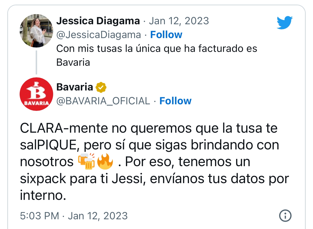 El trino llegó hasta la cuenta oficial de Bavaria, quien le respondió haciendo un juego de palabras con algunos fragmentos de la canción de Shakira y le ofreció un regalo.