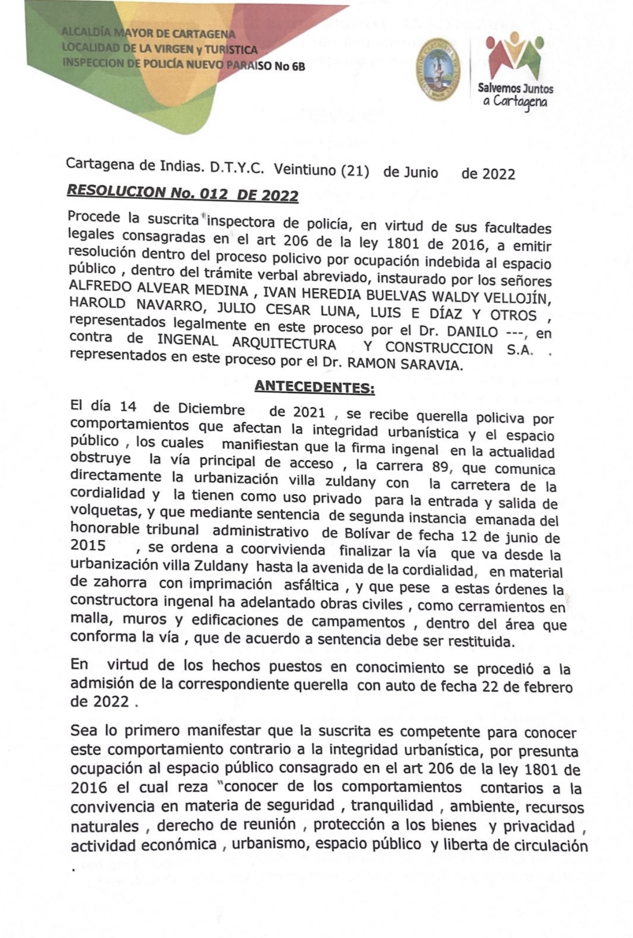 En el documento, queda por sentado ante la querella policial presentada por algunos miembros de la comunidad de Villa Zuldany que, la vía de la que acusaban a la constructora Ingenal por ocupación ilegal, hace parte de un bien privado soportado por su folio de matrícula y referencia catastral.