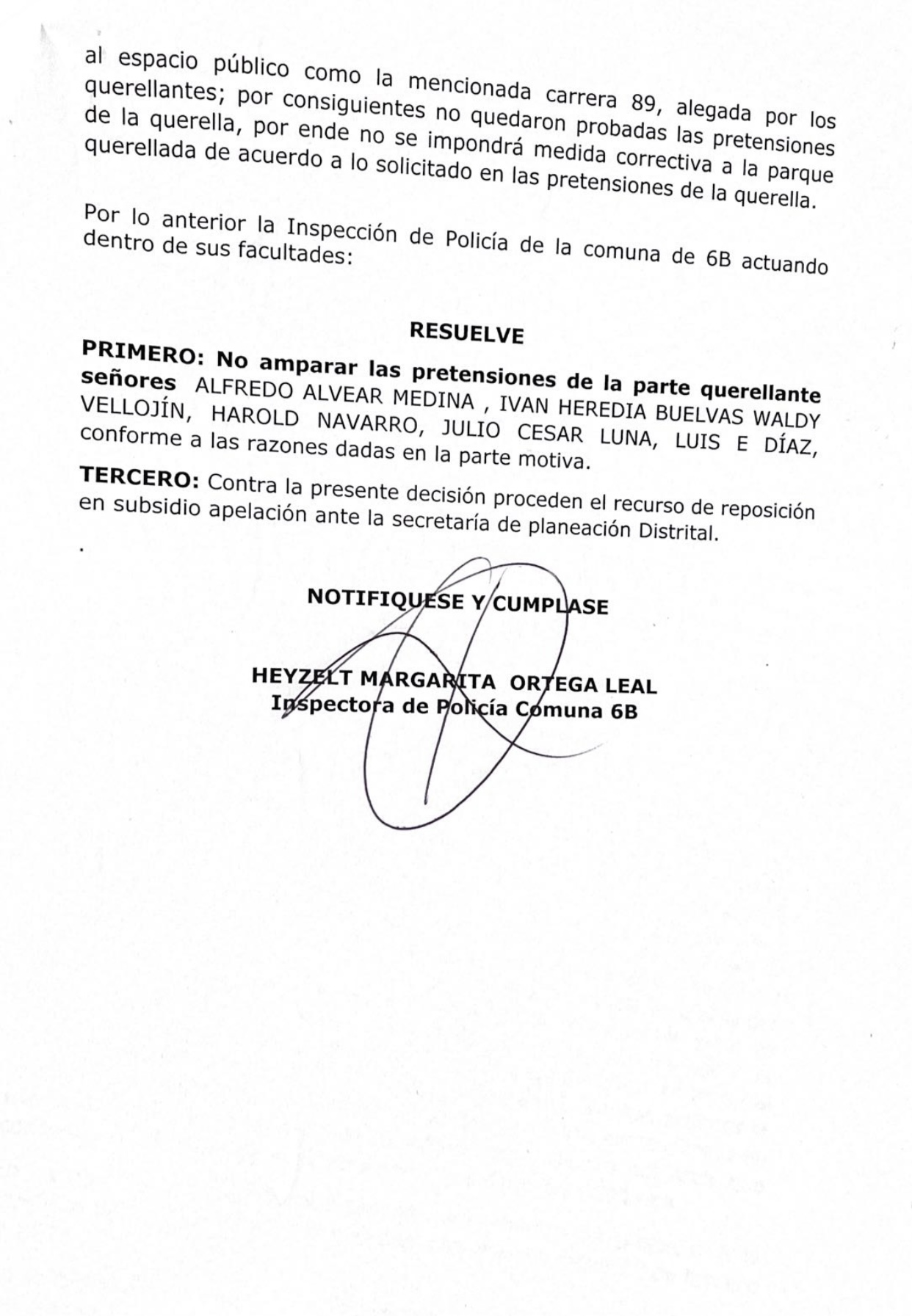 Así quedó registrado en la resolución 012 de 2022 firmada por la Inspectora de Policía Comuna 6B Heyzelt Ortega Leal.