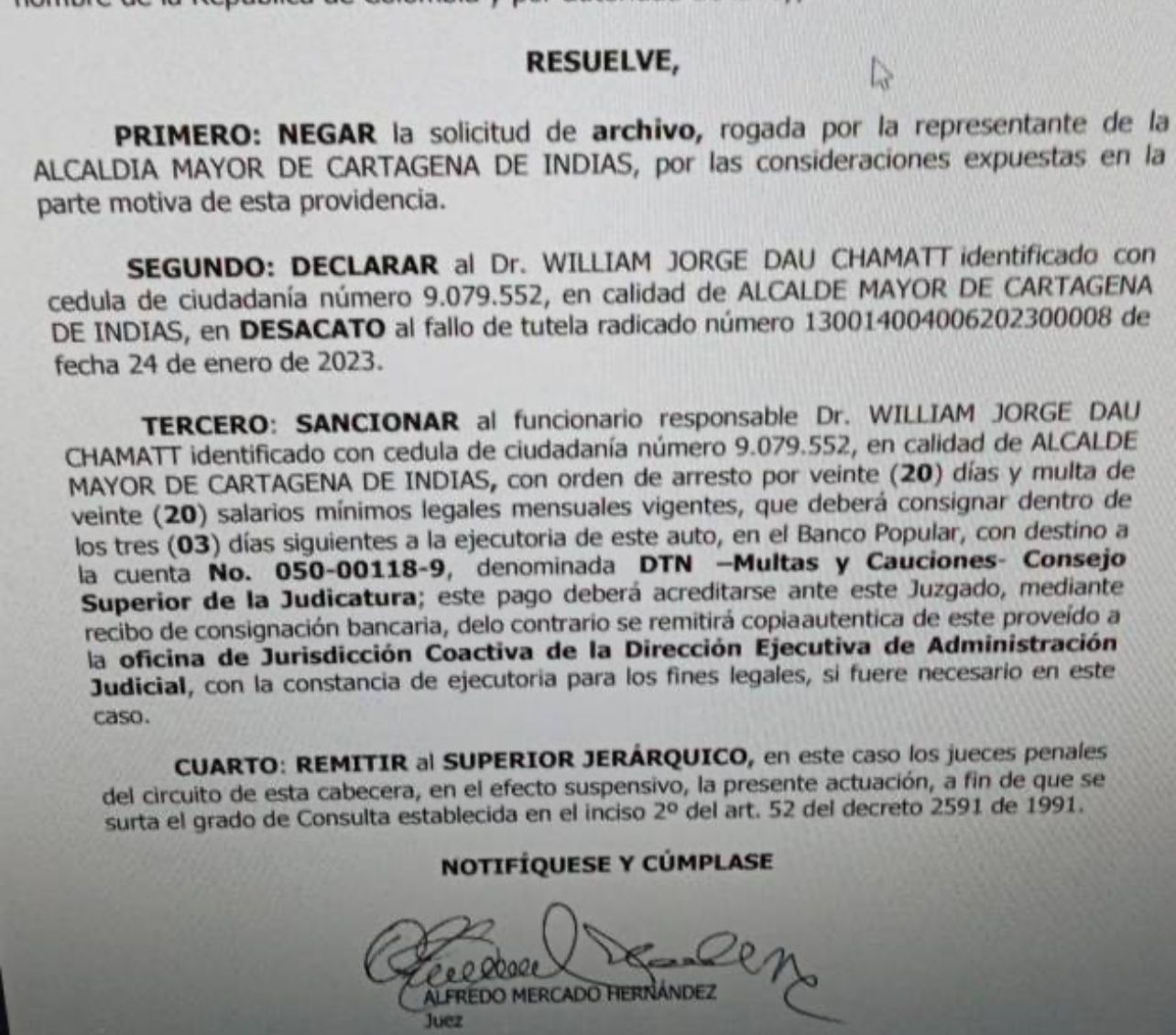 A pesar de ello, la alcaldía impugnó la decisión y pidió ser archivada. Ahora, ante el no cumplimiento de la orden, Mercado ha ordenado sanción de arresto de 20 días y una multa de 20 salarios mínimos legales mensuales vigentes al Alcalde.