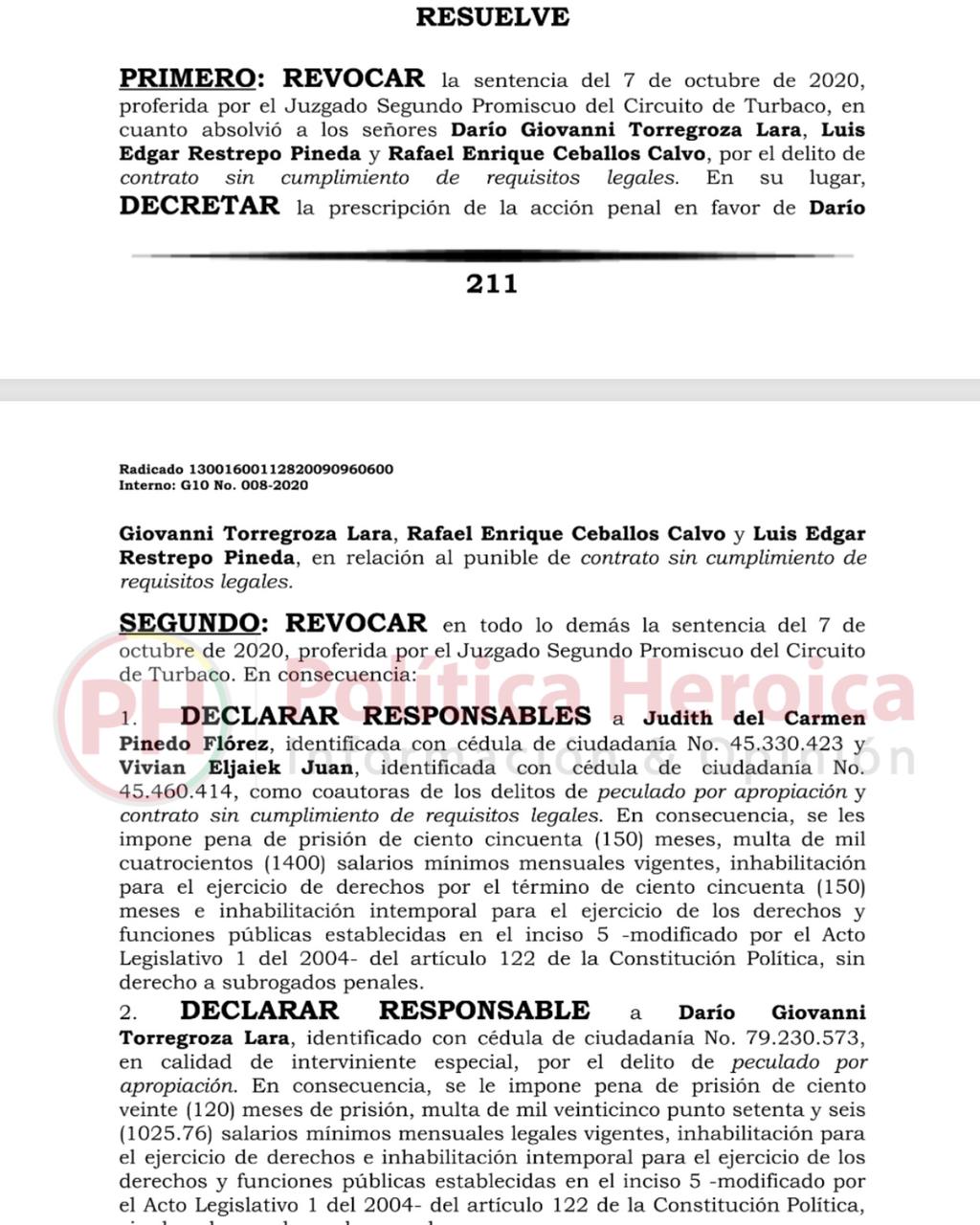 El día de hoy, la Sala Penal del Tribunal Superior de Cartagena aprobó sentencia que revoca absolución de la exalcaldesa de Cartagena Judith Pinedo, por los delitos de peculado por apropiación y contrato sin cumplimiento de los requisitos. Esta sentencia se profiere con relación a la venta del Polígono de Las Velas al Hotel Dann.