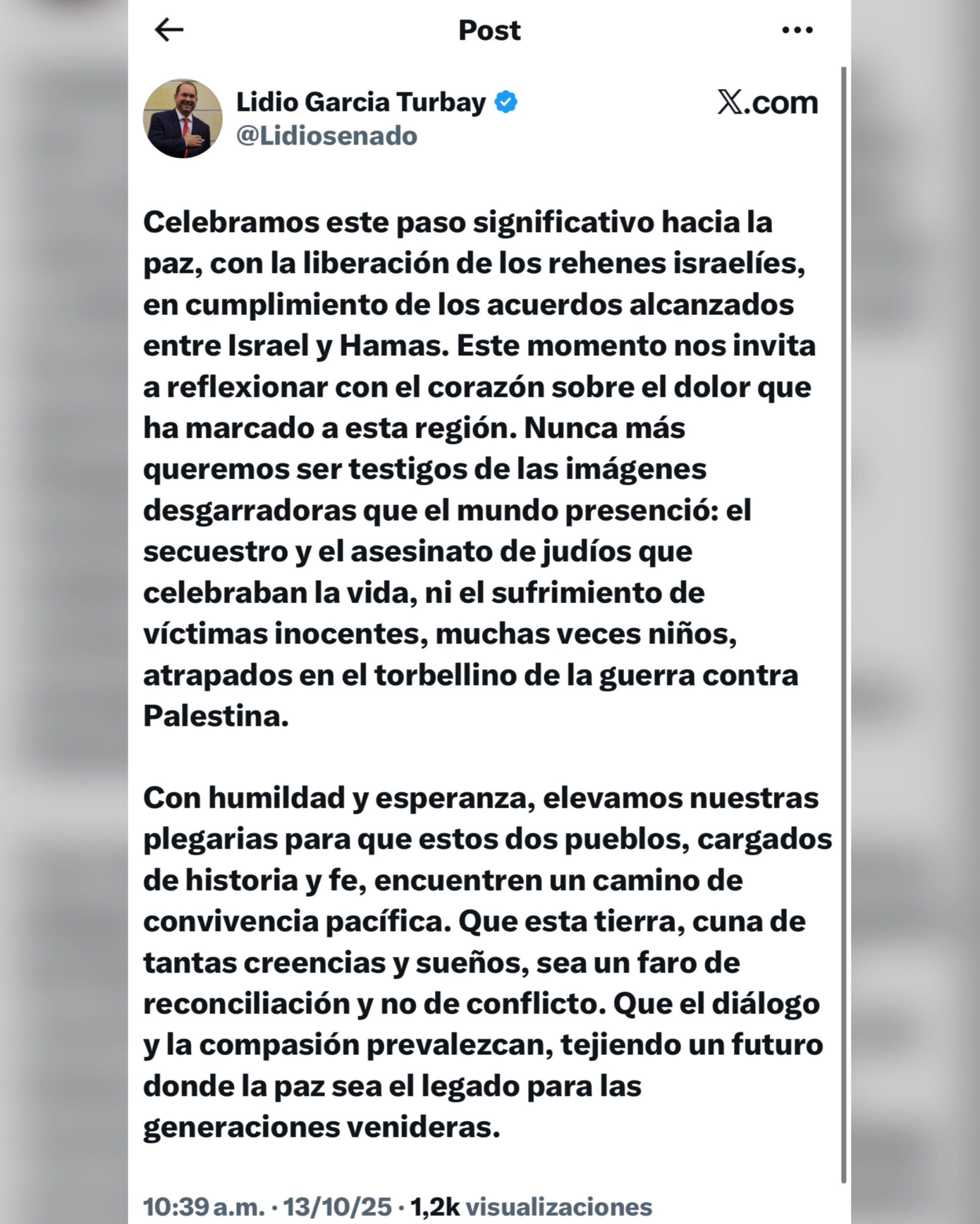 El senador colombiano Lidio García Turbay celebró la liberación de los últimos rehenes israelíes retenidos por Hamas, destacando este hecho como un paso esperanzador hacia la reconciliación entre Israel y Palestina.