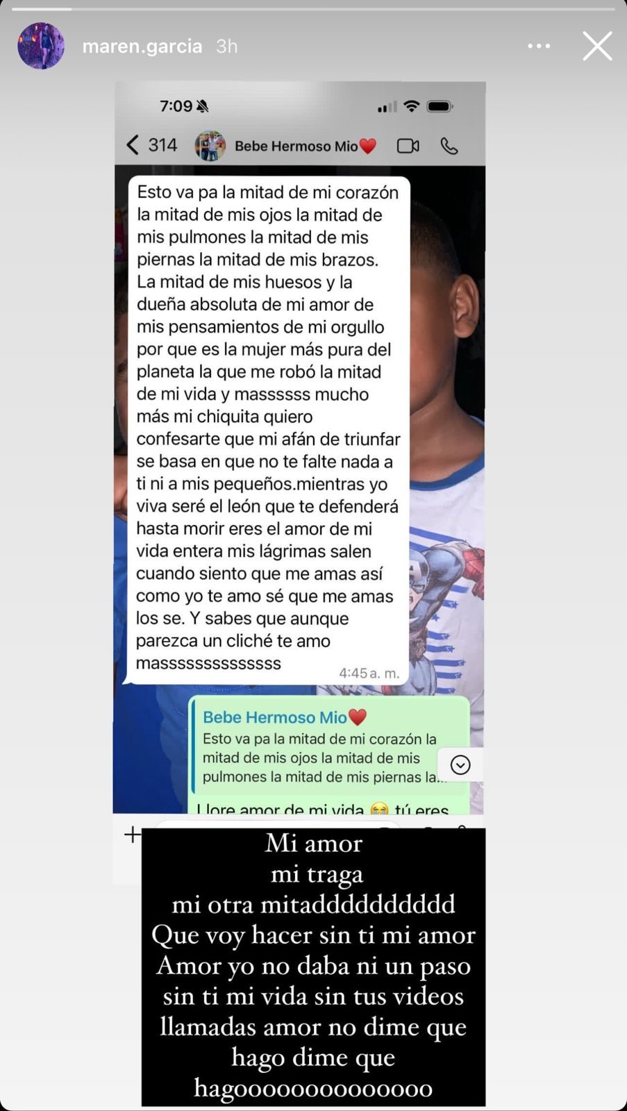 “Mi amor mi traga mi otra mitadddddddddd. Que voy hacer sin ti mi amor. Amor yo no daba ni un paso sin ti mi vida sin tus videos llamadas amor no dime que hago dime que hagooooooooooo”, escribió García en su última historia de Instagram.