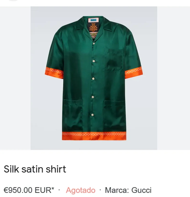 La camisa en cuestión, de color verde oscuro brillante con bordes naranjas en las mangas y base, es un modelo de la exclusiva marca Gucci y se oferta en 950 euros en los sitios web dedicados a comercializarla.