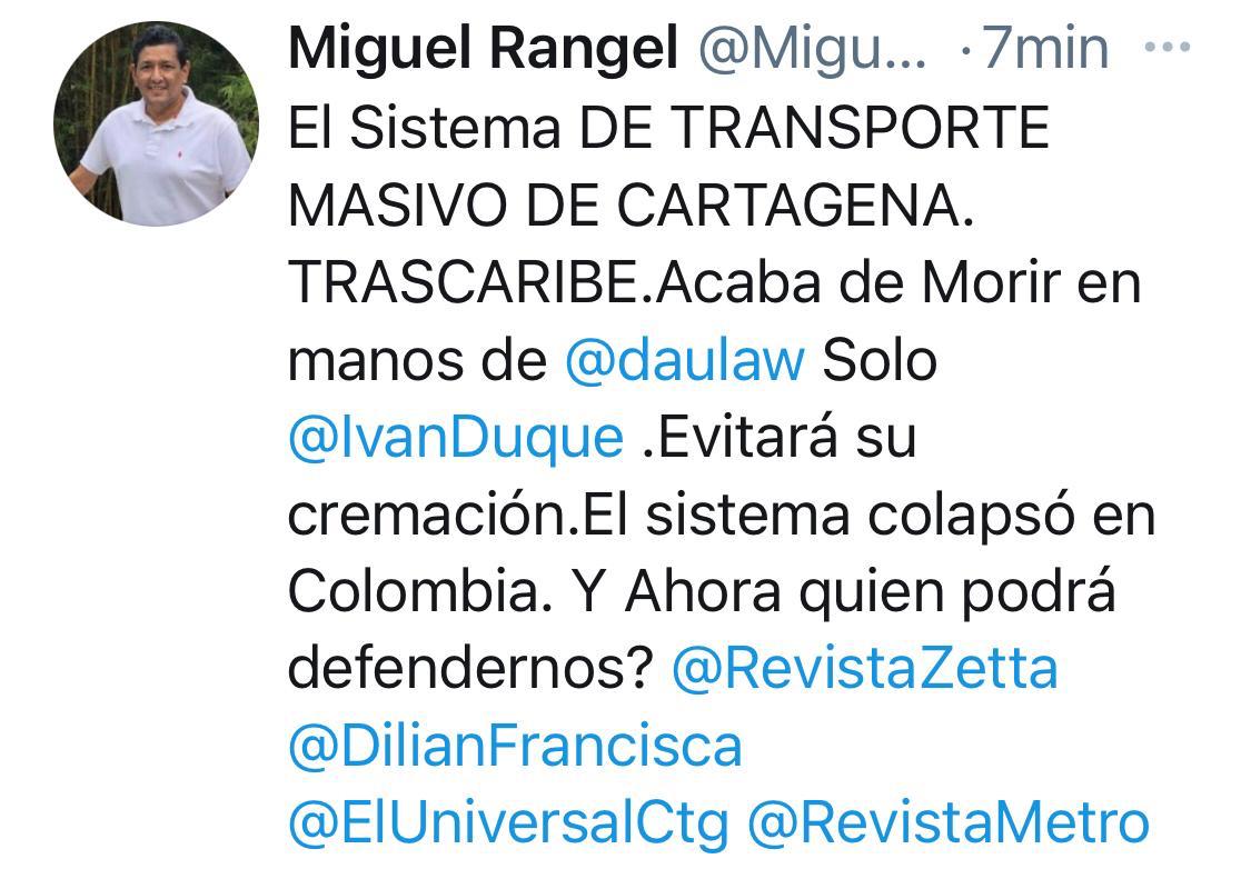 Recientemente, el excongresista Miguel Rangel, quien ha sido tajante en afirmar que apoya al alcalde Dau, publicó un mensaje donde cuestiona que el alcalde dejó morir a este importante sistema cartagenero. “El Sistema de transporte masivo de Cartagena Transcaribe acaba de morir en manos de Dau. Solo Iván Duque evitará su cremación. El sistema colapsó en Colombia, ¿y ahora quién podrá defendernos?”, puntualizó el dirigente.