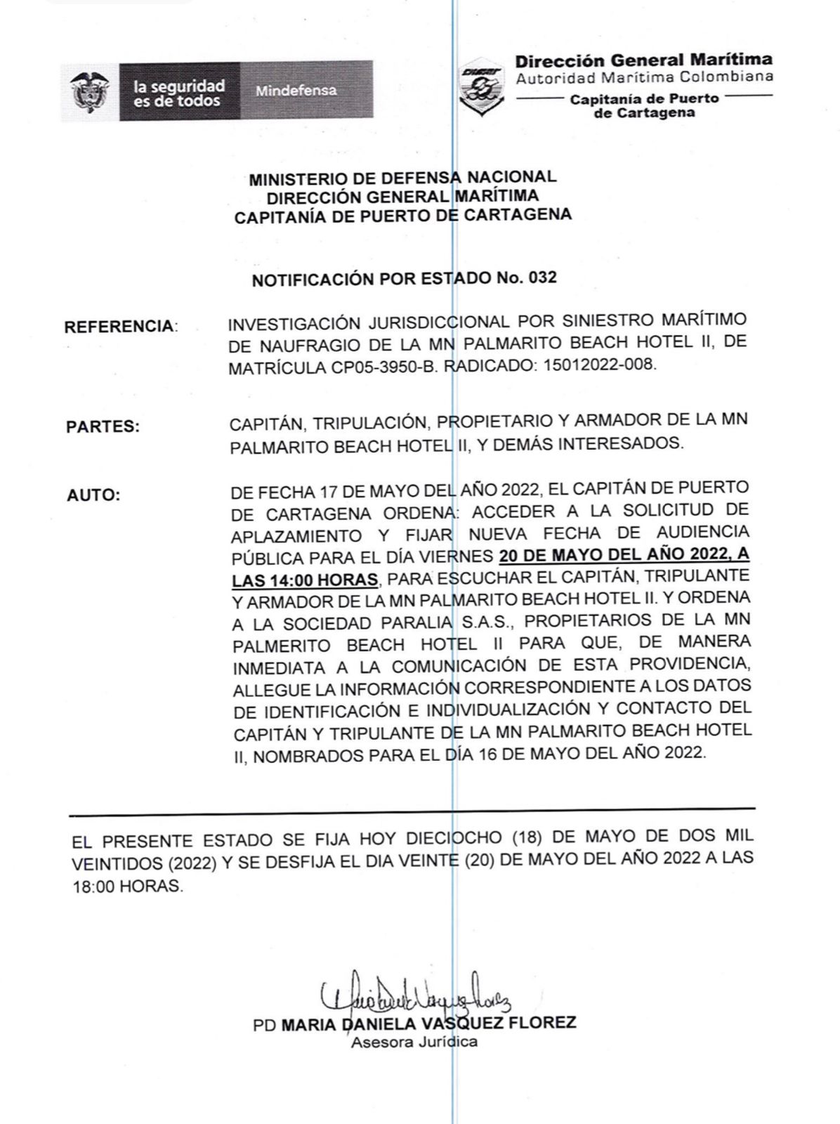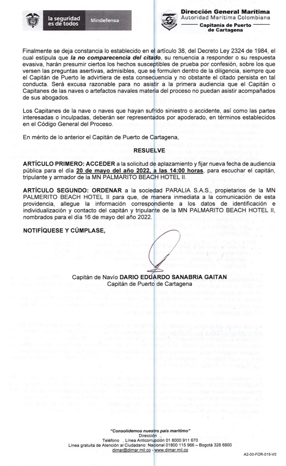 Así las cosas, la audiencia fue reprogramada para el día de ayer, donde se escucharía al Capitán, tripulante y armador de la MN PALMARITO BEACH II.