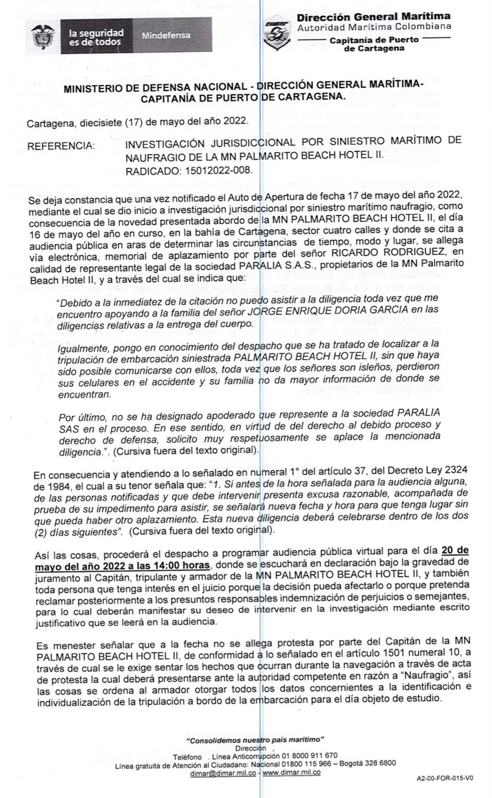 Los hechos se registraron el pasado 16 de mayo, en la embarcación MN PALMARITO BEACH HOTEL. La persona fallecida fue identificada como Jorge Enrique Doria García.