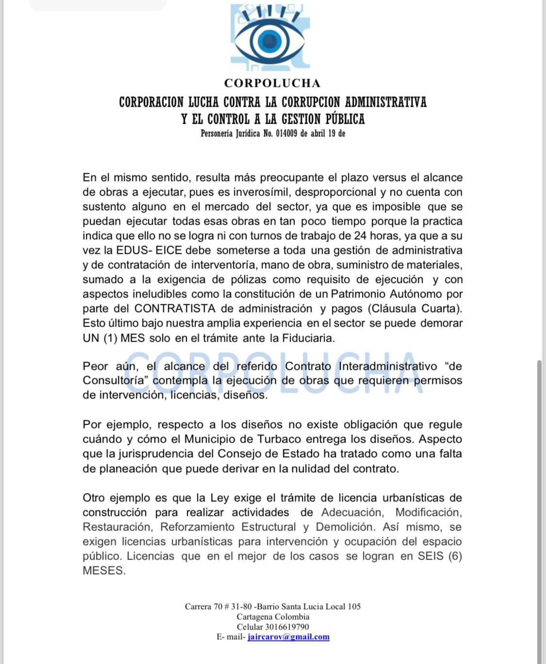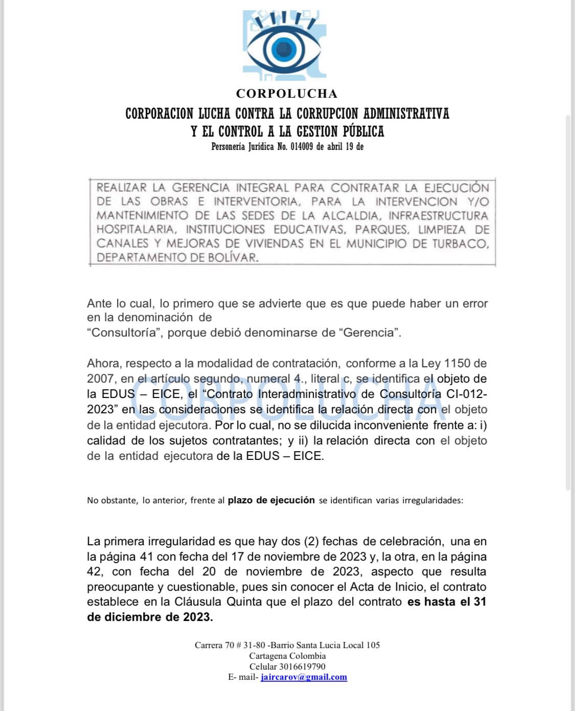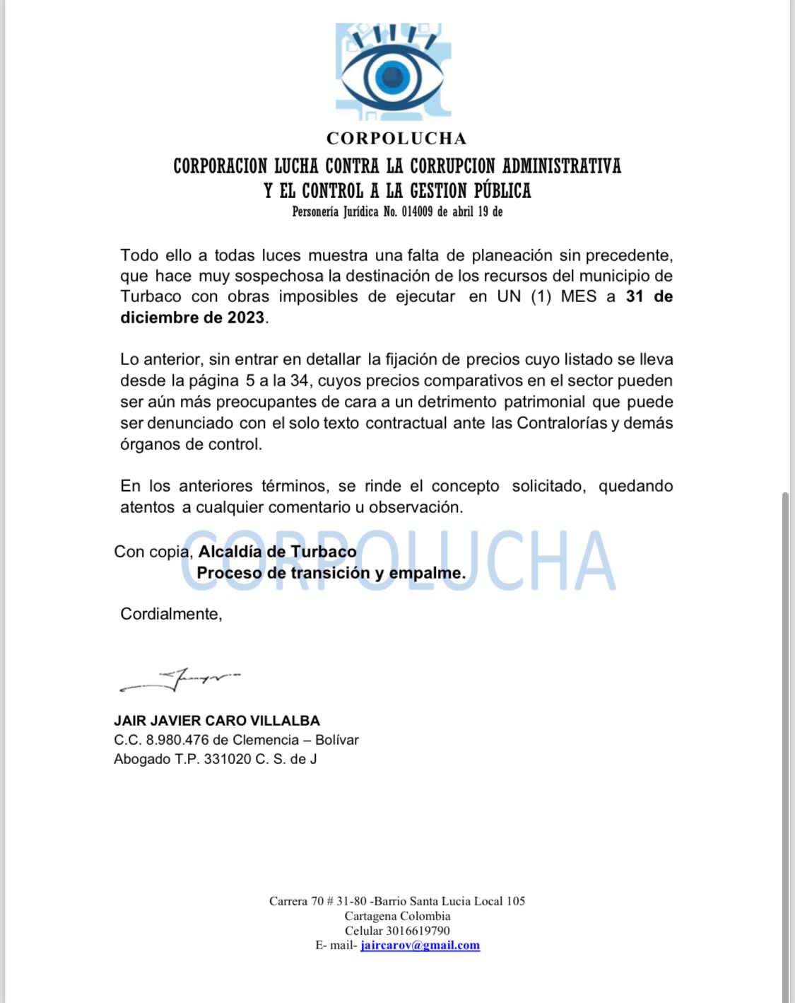 Todo ello a todas luces muestra una falta de planeación sin precedente, que hace muy sospechosa la destinación de los recursos del municipio de Turbaco con obras imposibles de ejecutar en un mes a 31 de diciembre de 2023.
