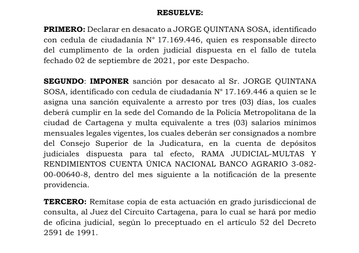 “Imponer sanción por desacato al señor Jorge Quintana Sosa, a quien se le asigna una sanción equivalente a arresto por tres (03) días, los cuales deberá cumplir en la sede del Comando de la Policía Metropolitana de la ciudad de Cartagena y multa equivalente a tres (03) salarios mínimos mensuales legales vigentes, los cuales deberán ser consignados a nombre del Consejo Superior de la Judicatura, dentro del mes siguiente a la notificación de la presente providencia”, se lee en el documento.