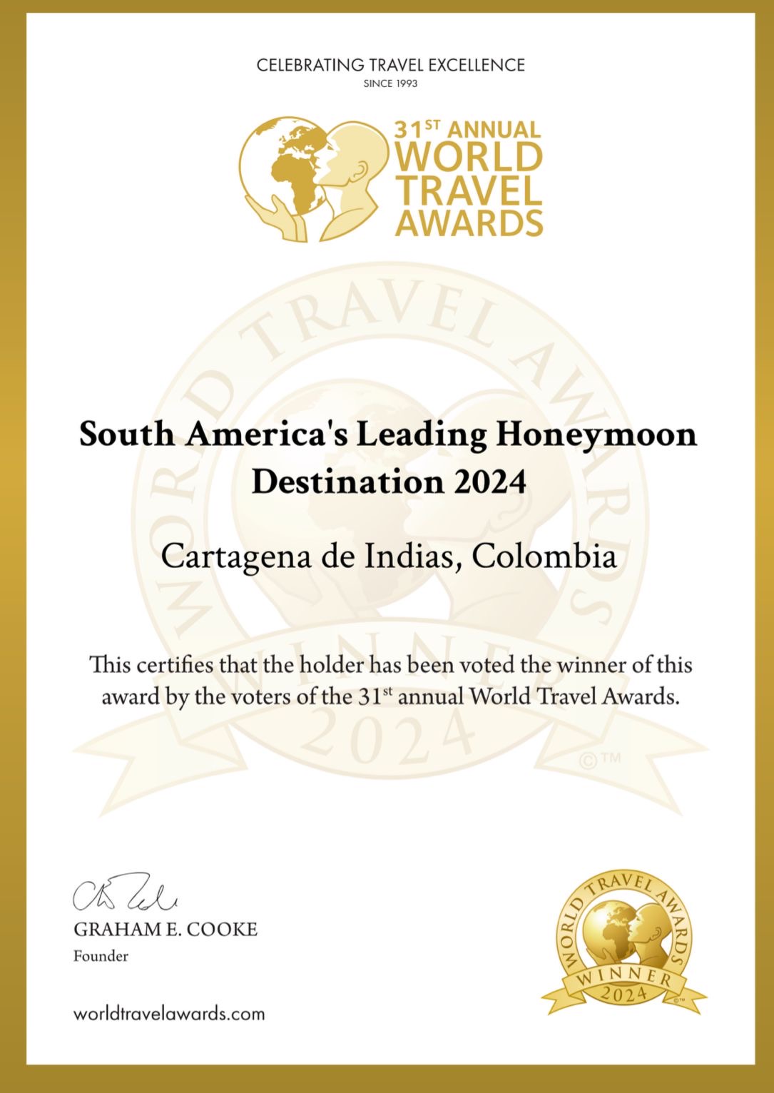 Cartagena de Indias ha sido elegida en los World Travel Awards, considerados como los “Oscar del Turismo” como mejor “Destino de Luna de Miel de Suramérica». Un reconocimiento que exalta la preferencia de los recién casados por vivir los primeros días de su unión en Cartagena de Indias y disfrutar de su oferta turística. Por sexta vez, la ciudad obtiene este premio, luego de recibirlo en 2018, 2019, 2020, 2021 y 2022.