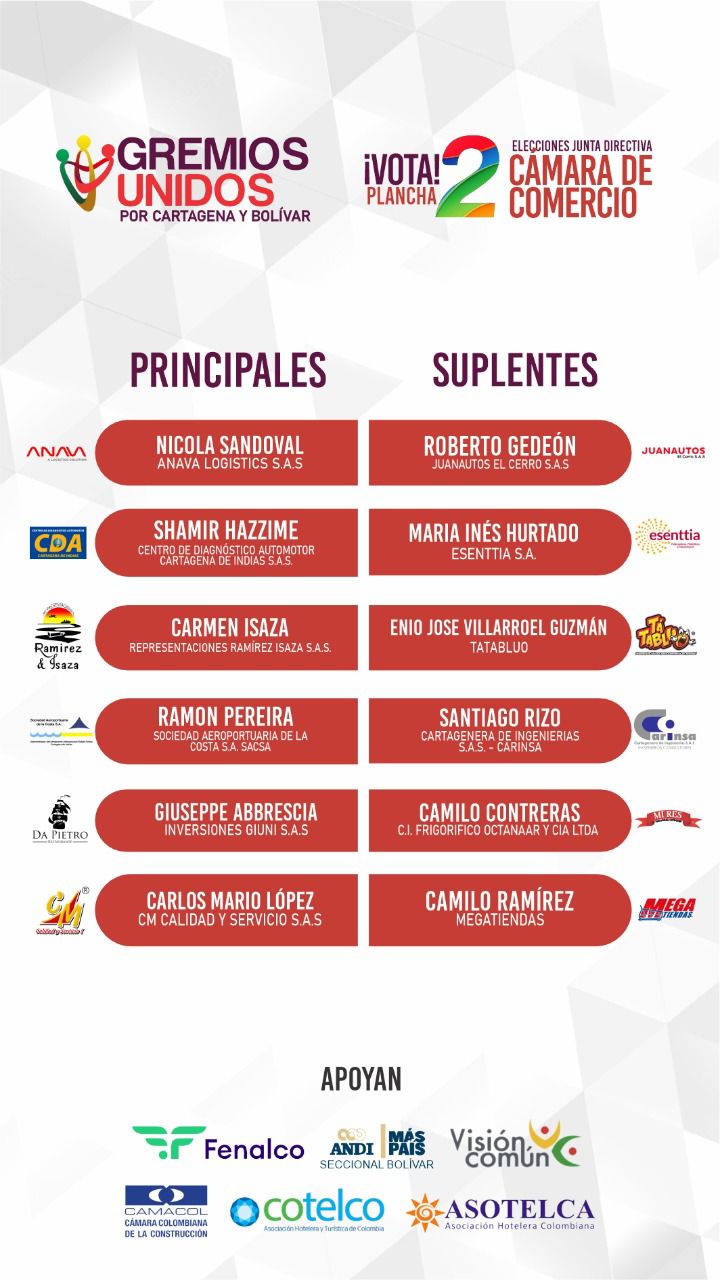 Nicolás Sandoval de Anava Logistics SAS, Shamir Hazzime del centro de diagnostico automotor Cartagena de indias, Carmen Isaza de Representaciones Ramírez Isaza SAS, Ramón Pereira de Sociedad Aeroportuaria de la Costa SACSA, Giuseppe Abbrescia de inversiones Giuni SAS, Carlos Mario Lopez de CM Calidad y Servicios SAS.