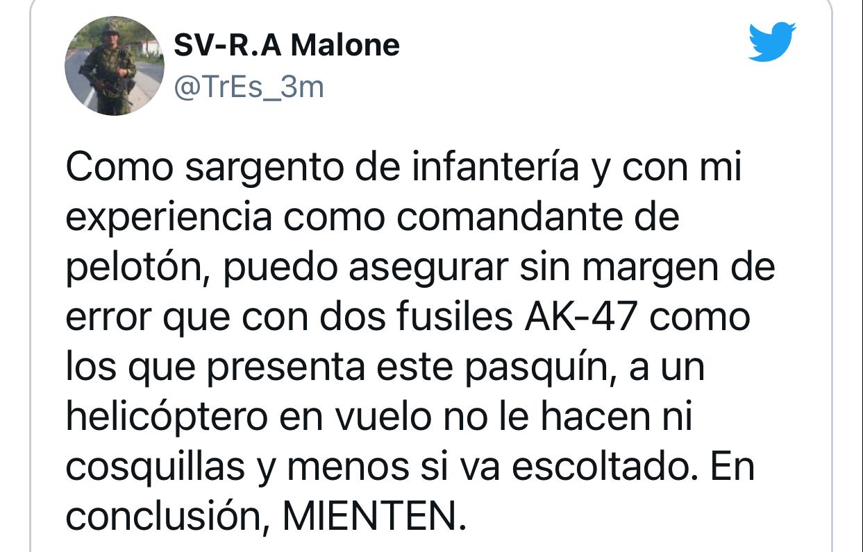 «Como sargento de infantería y con mi experiencia como comandante de pelotón, puedo asegurar sin margen de error que con dos fusiles AK-47 como los que presenta este pasquín, a un helicóptero en vuelo no le hacen ni cosquillas y menos si va escoltado. En conclusión, MIENTEN», aseguró el militar.